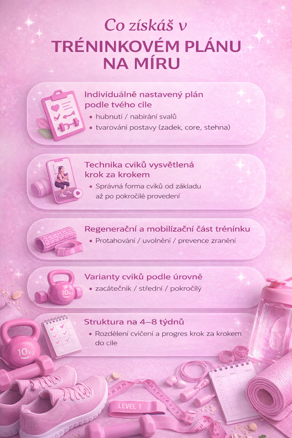 Každý z vás má jiný příběh, jiné cíle i jiné tempo. Proto ke každému přistupuji individuálně a společně nastavíme plán tak, aby dával smysl právě tobě. Součástí spolupráce je vstupní konzultace, pravidelná komunikace a průběžné úpravy podle toho, jak se budeš posouvat. Ať už jsi na úplném začátku, nebo chceš svou formu posunout na vyšší úroveň, jsem připravena tě vést krok za krokem!
